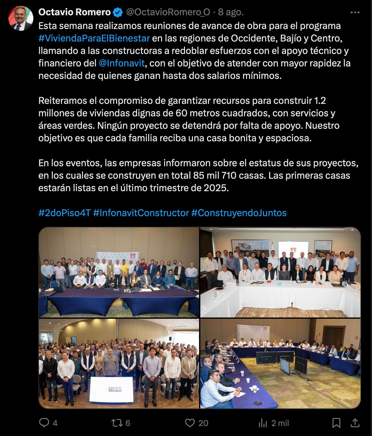 El director general del Infonavit, Octavio Romero Oropeza, informó que las primeras viviendas del programa “Vivienda para el Bienestar” estarán concluidas y listas para su entrega durante el último trimestre de 2025. El anuncio se dio tras una serie de reuniones de avance de obra en las regiones de Occidente, Bajío y Centro, donde llamó a las constructoras a redoblar esfuerzos con el respaldo técnico y financiero del instituto.