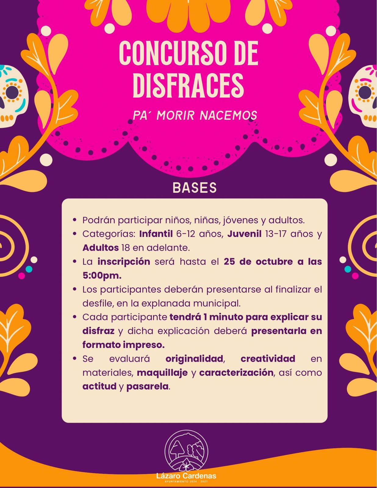 • 🎨 Concurso de Ofrendas: dirigido a escuelas, áreas municipales y grupos culturales.