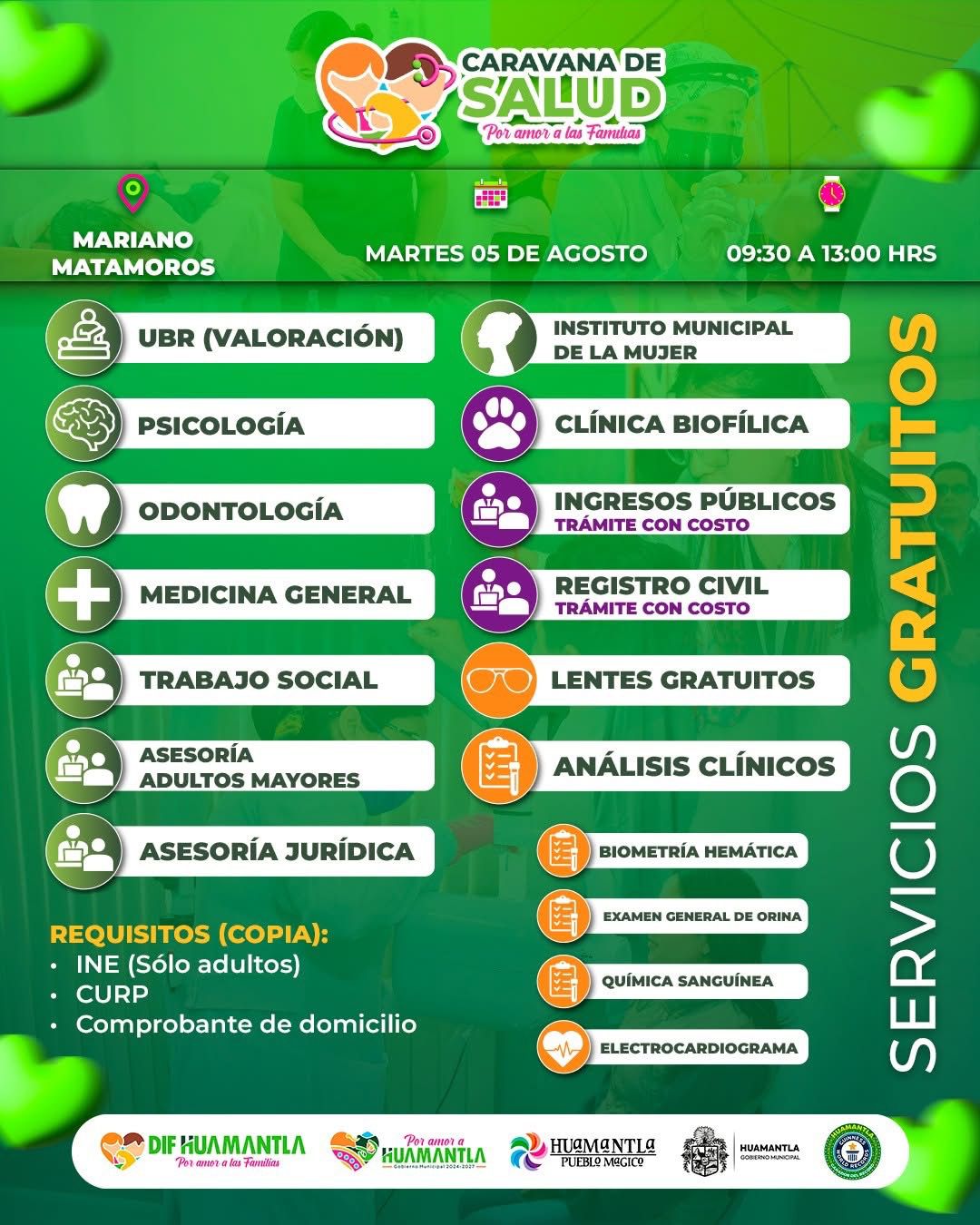 Con el objetivo de acercar servicios esenciales y mejorar la calidad de vida de las familias huamantlecas, el Gobierno Municipal de Huamantla, que encabeza Salvador Santos Cedillo, a través del Sistema DIF Municipal, llevará a cabo este martes 5 de agosto una jornada más de la Caravana de Salud y Servicios en la comunidad de Mariano Matamoros.