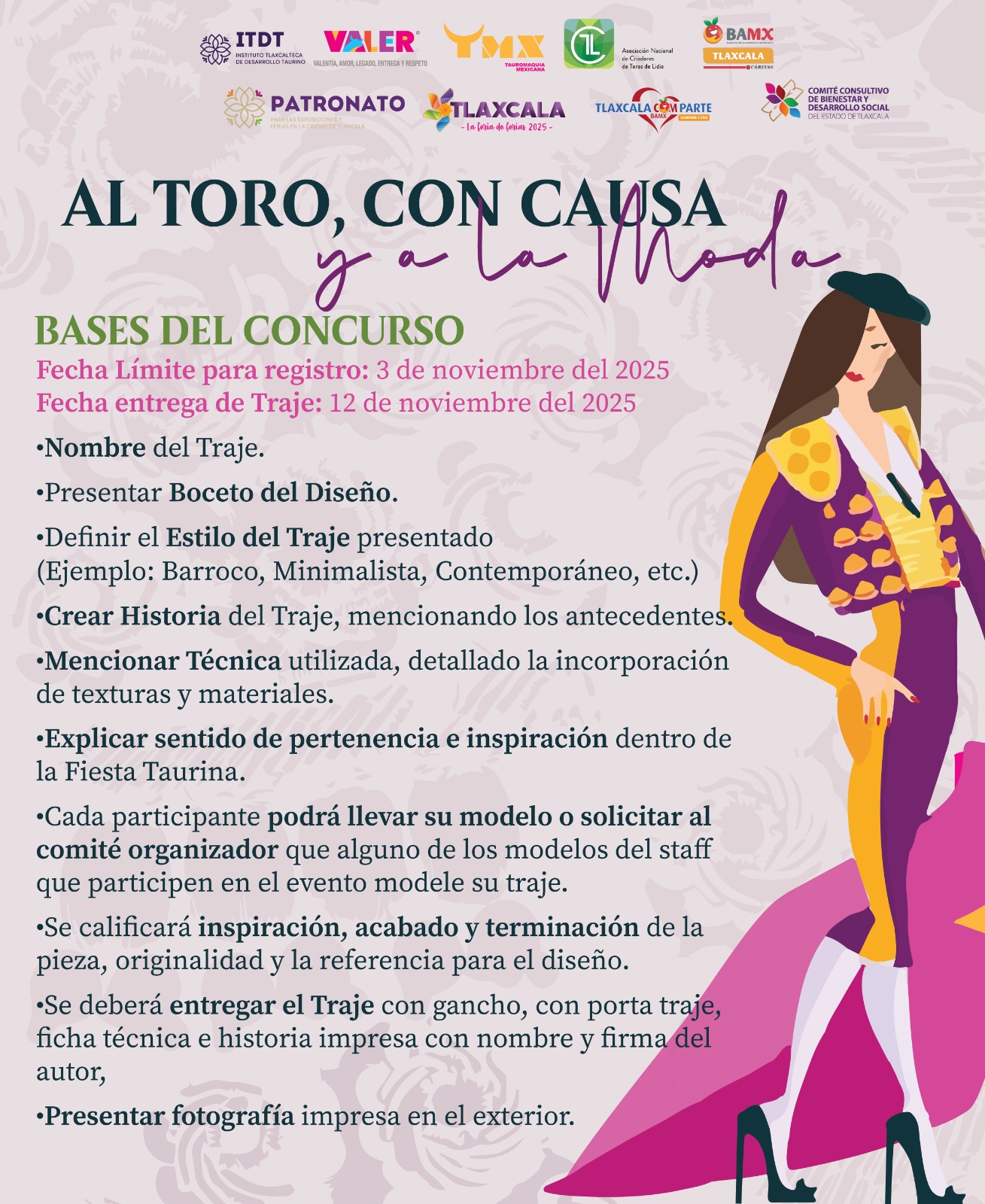 La convocatoria completa se puede consultar en las redes sociales de Tlaxcala, la Feria de Ferias 2025, y Tauromaquia Mexicana, capítulo Tlaxcala. Informes y venta de boletos: stephquinterob@gmail.com o al teléfono 55 6233 5783.