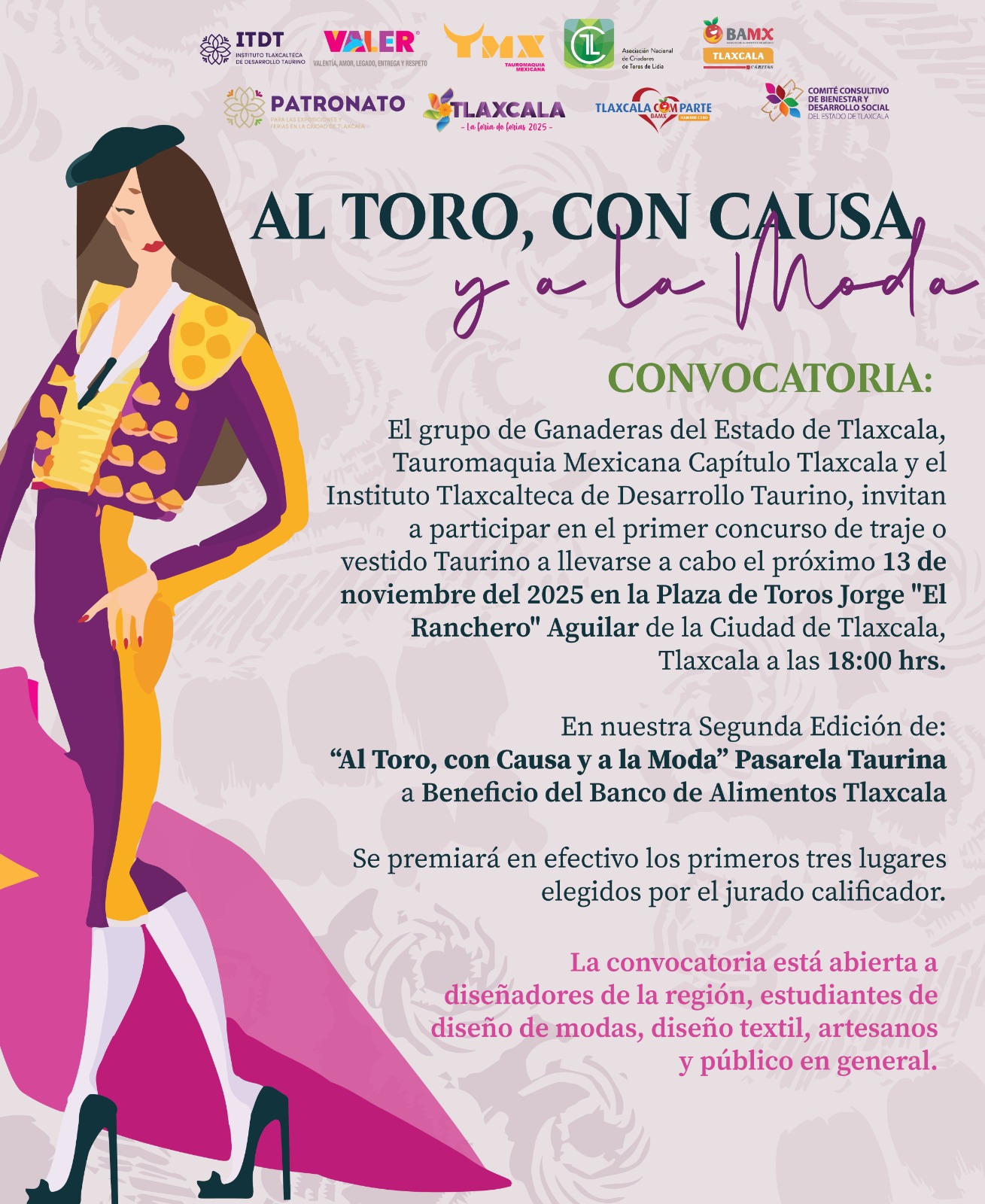 El Patronato para las Exposiciones y Ferias en la Ciudad de Tlaxcala, y el grupo de Ganaderas de Toros de Lidia, anunciaron la segunda edición de la pasarela benéfica “Al Toro con Causa y a la Moda”, evento que reunirá a diseñadores locales y nacionales para reinterpretar la estética taurina en prendas, accesorios y textiles.
