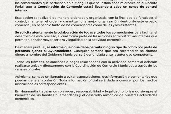 La autoridad municipal precisó que el proceso se realizará de manera ordenada y transparente, por lo que se solicita la colaboración de todas y todos los comerciantes para facilitar el levantamiento de la información correspondiente.