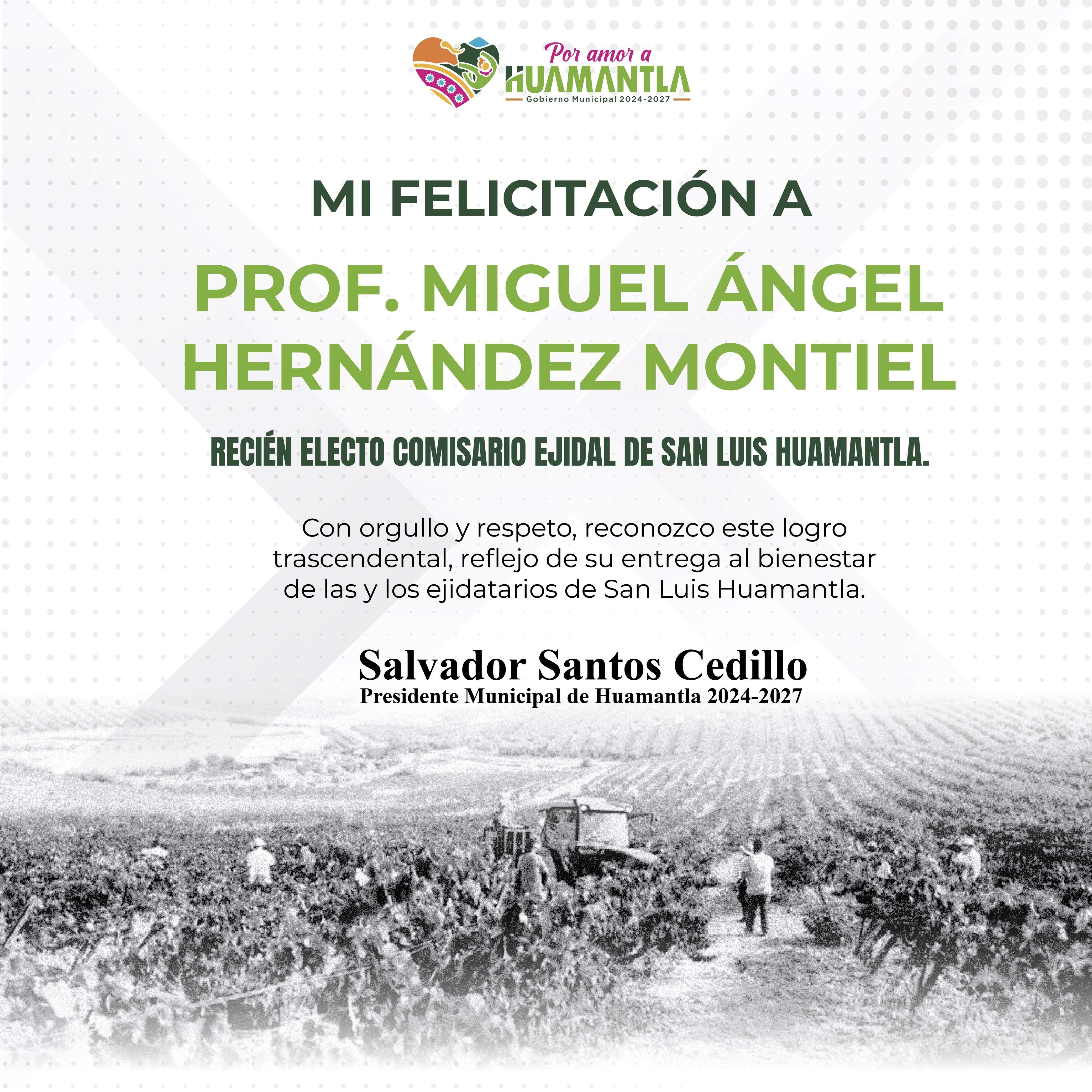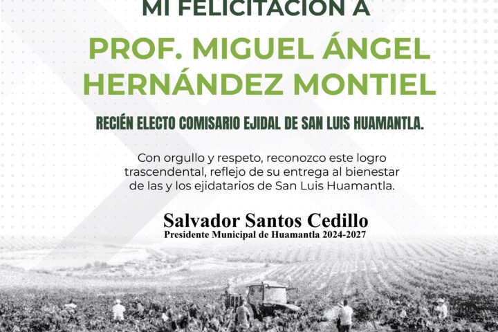 El presidente municipal de Huamantla, Salvador Santos, felicitó al C. Miguel Ángel Hernández Montiel, quien resultó electo como nuevo comisariado ejidal de San Luis Huamantla tras una jornada democrática y participativa celebrada el pasado domingo 22 de junio.