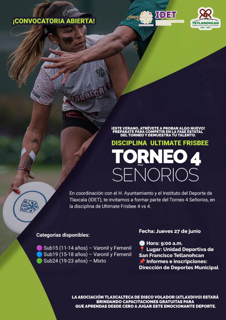 El próximo jueves 27 de junio, el municipio de San Francisco Tetlanohcan será sede del Torneo 4 Señoríos, en la disciplina Ultimate Frisbee 4 vs 4, una actividad impulsada en coordinación con el Instituto del Deporte de Tlaxcala (IDET) y el Gobierno Municipal que encabeza la presidenta Kritsbey Pérez Flores.