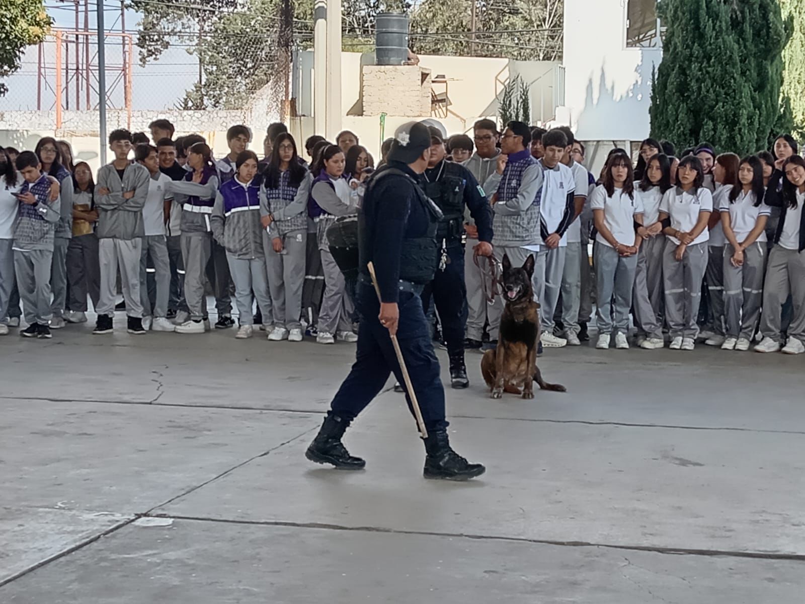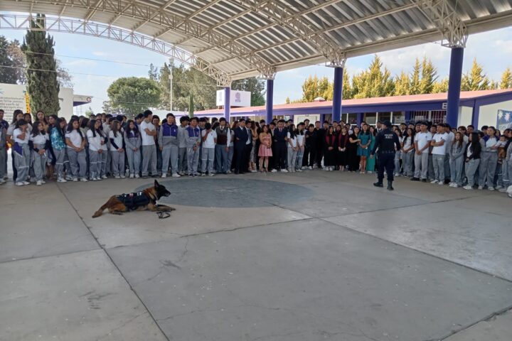 La Dirección de Seguridad Pública, Tránsito y Protección Civil de Huamantla llevó a cabo una demostración del agrupamiento K-9 en el plantel COBAT 02 turno vespertino, como parte de las acciones de proximidad social y prevención del delito que impulsa el Gobierno Municipal.