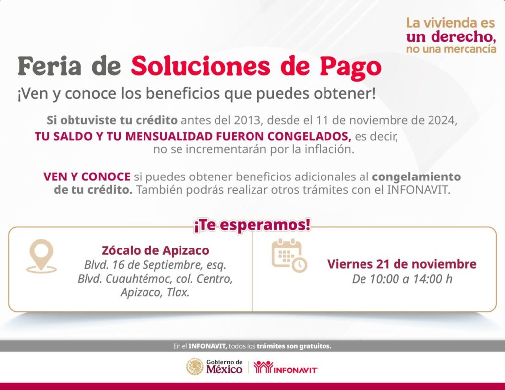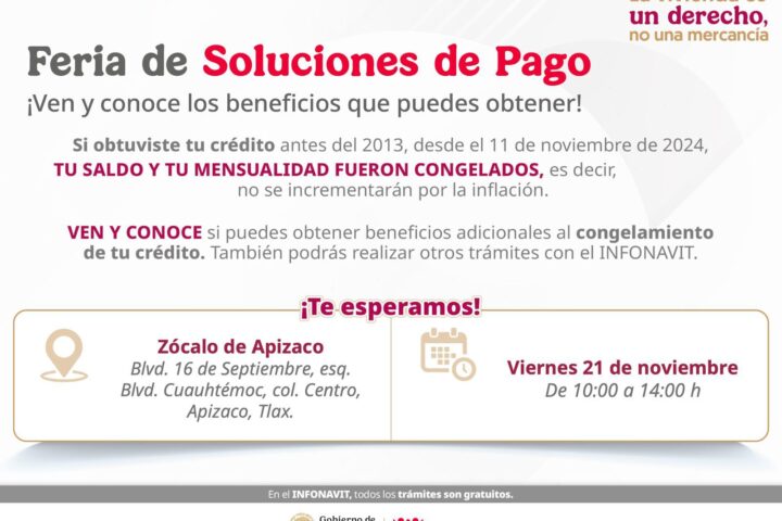 El Ayuntamiento de Apizaco, que encabeza el presidente municipal, Javier Rivera Bonilla, en coordinación con el Instituto del Fondo Nacional de la Vivienda para los Trabajadores (Infonavit), realizarán la Feria de Soluciones de Pago el próximo viernes 21 de noviembre, con el objetivo de acercar servicios y alternativas financieras a las y los trabajadores de la región.