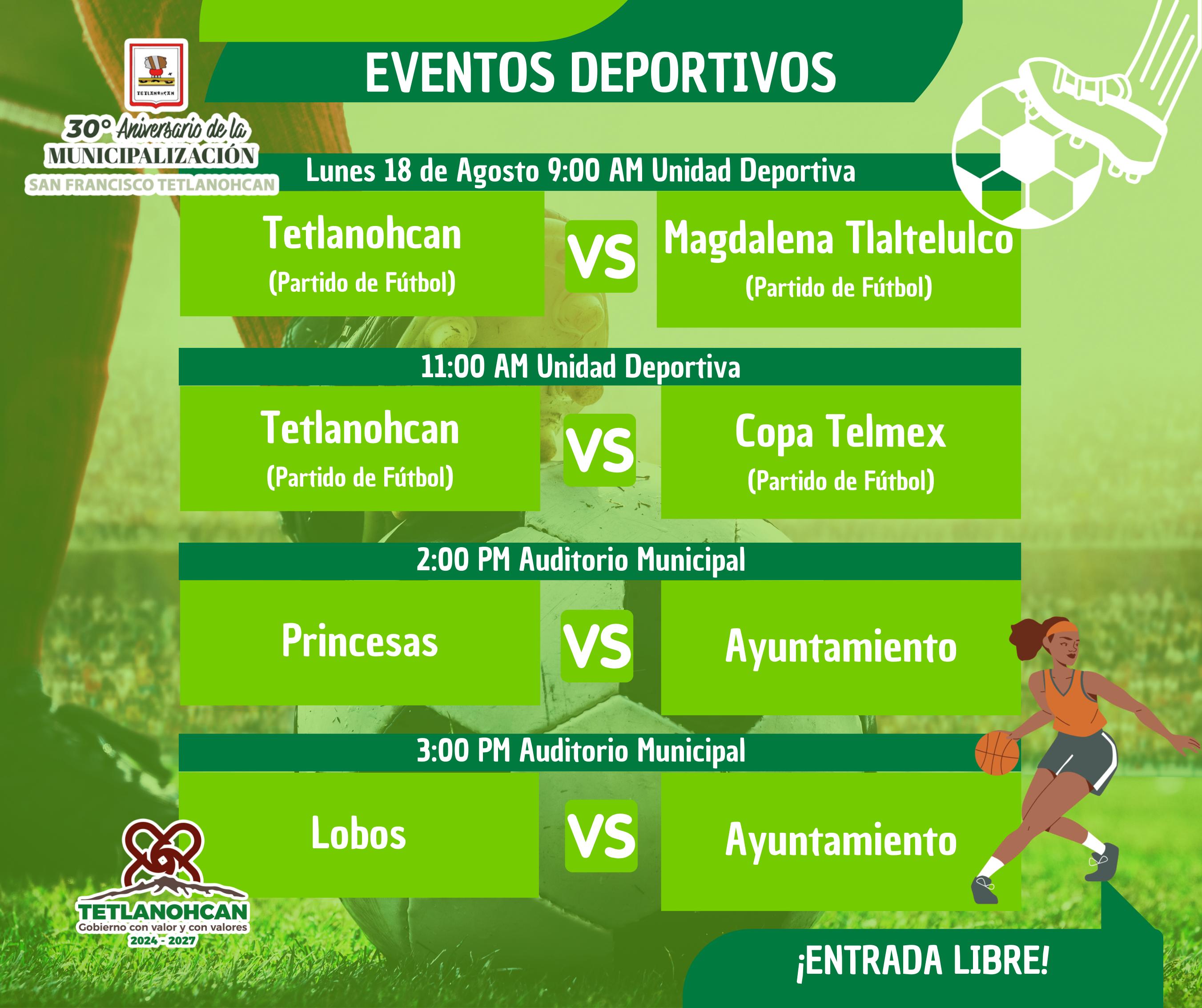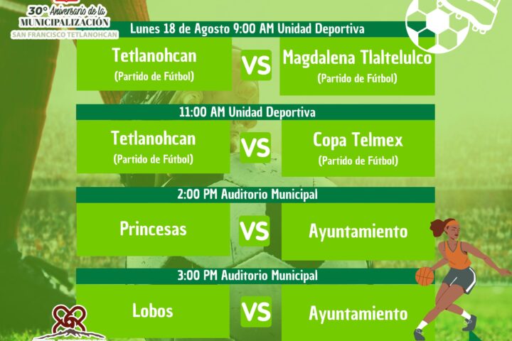 Las actividades darán inicio a las 9:00 de la mañana en la Unidad Deportiva con el partido de fútbol entre Tetlanohcan y Magdalena Tlaltelulco; seguido, a las 11:00 horas, del encuentro entre Tetlanohcan y el representativo de la Copa Telmex.