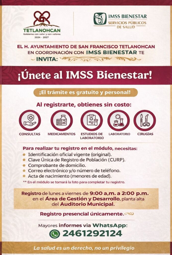 El Gobierno Municipal de San Francisco Tetlanohcan, que encabeza la presidenta municipal Kritsbey Pérez Flores, informa a la población que ya se encuentra habilitado el módulo de registro al programa IMSS Bienestar, con el objetivo de acercar servicios de salud gratuitos a las familias del municipio.