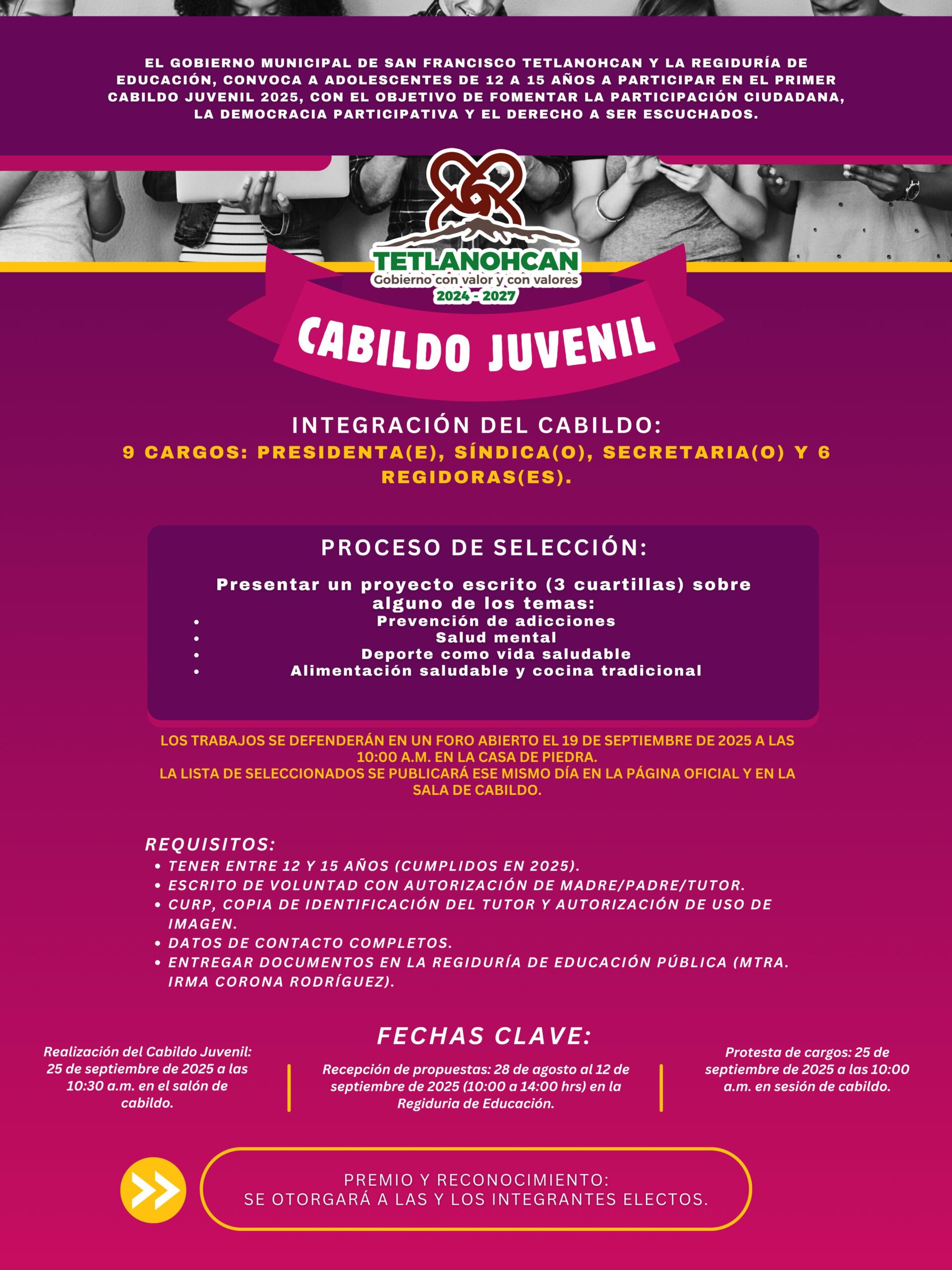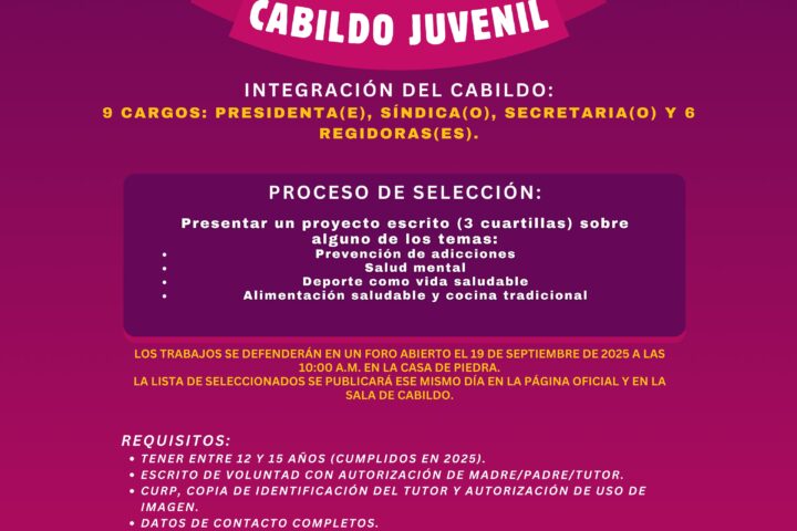 La convocatoria está dirigida a jóvenes de entre 12 y 15 años cumplidos en 2025, quienes deberán presentar un proyecto escrito que aborde temas relacionados con la prevención de adicciones, la salud mental, el deporte como una alternativa de vida saludable, así como la alimentación balanceada y la cocina tradicional. Los trabajos serán defendidos en un foro abierto que se llevará a cabo el 19 de septiembre en la Casa de Piedra, y de este proceso surgirán quienes integren el Cabildo Juvenil con los cargos de presidenta o presidente, síndico, secretaria o secretario y seis regidoras o regidores.