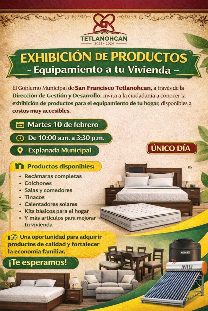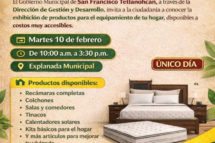 El Gobierno Municipal de San Francisco Tetlanohcan, que encabeza la presidenta municipal Kritsbey Pérez Flores, a través de la Dirección de Gestión y Desarrollo, invita a la ciudadanía a la exhibición de productos del programa Equipamiento a tu Vivienda, una iniciativa que busca apoyar la economía familiar mediante la oferta de artículos para el hogar a costos muy accesibles.