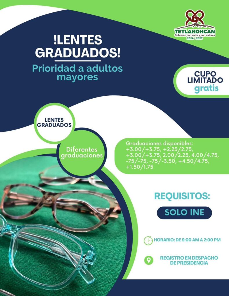 El H. Ayuntamiento de Tetlanohcan, administración 2024–2027, anunció la puesta en marcha del programa de entrega gratuita de lentes graduados, con el objetivo de apoyar la salud visual de quienes más lo necesitan, dando prioridad a las personas adultas mayores.