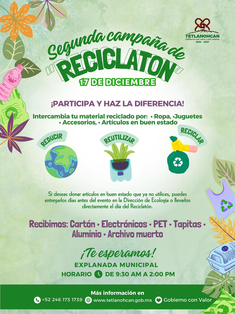 Con el objetivo de fomentar la cultura del reciclaje, el cuidado del medio ambiente y la solidaridad comunitaria, el Gobierno Municipal de Tetlanohcan, encabezado por la Presidenta Municipal Kritsbey Pérez Flores, llevará a cabo la Segunda Campaña de Reciclatón este martes 17 de diciembre, en la Explanada Municipal, en un horario de 9:30 de la mañana a 2:00 de la tarde.