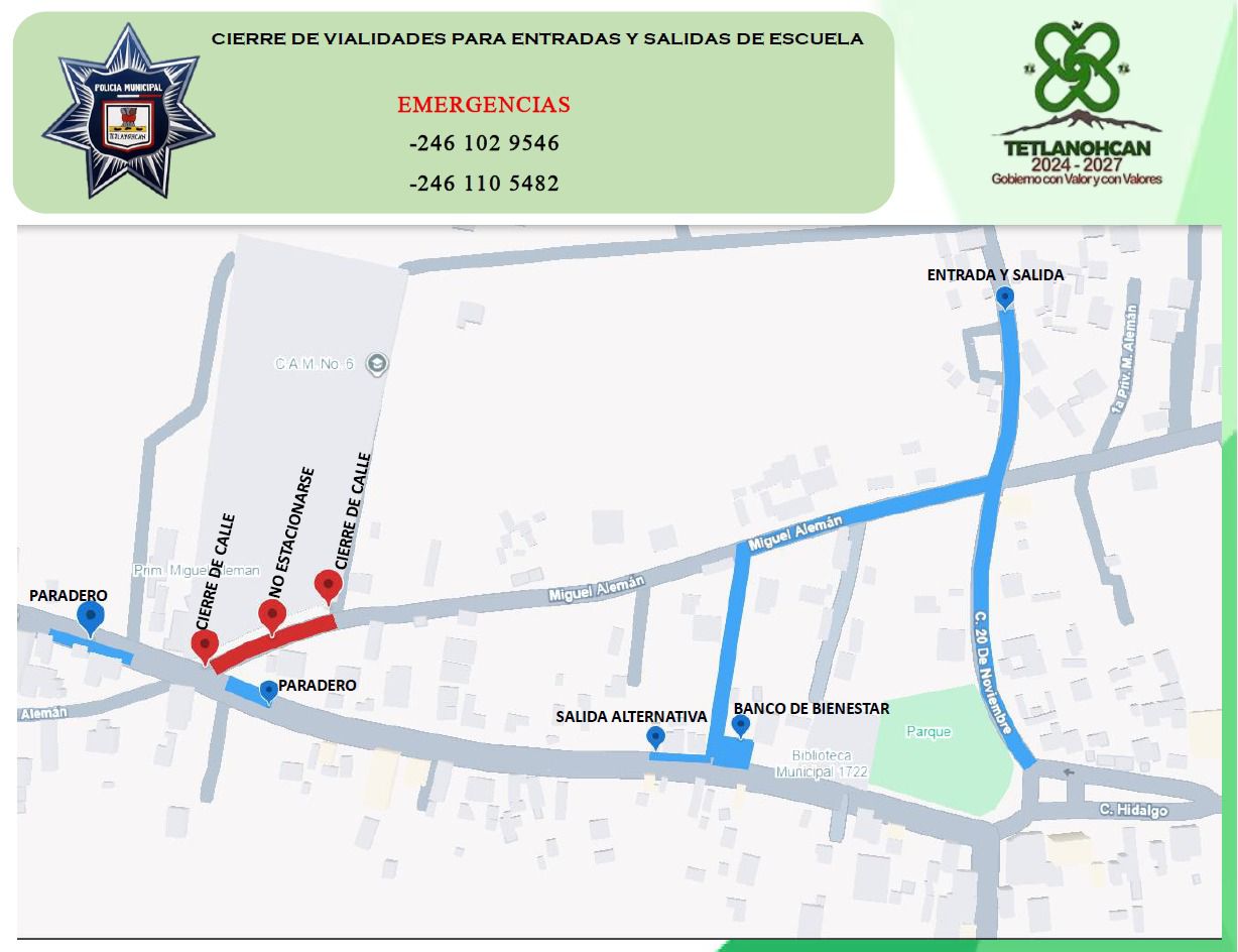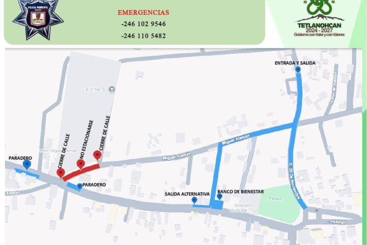 Con el objetivo de garantizar la seguridad de estudiantes, padres de familia y peatones, el Gobierno Municipal de Tetlanohcan, que encabeza la presidenta Kritsbey Pérez Flores, implementará a partir del 27 de octubre el cierre parcial de vialidades en la zona escolar donde se ubican la Escuela Primaria “Miguel Alemán”, el CAM 06 y la Telesecundaria No. 4 “Señoríos”.