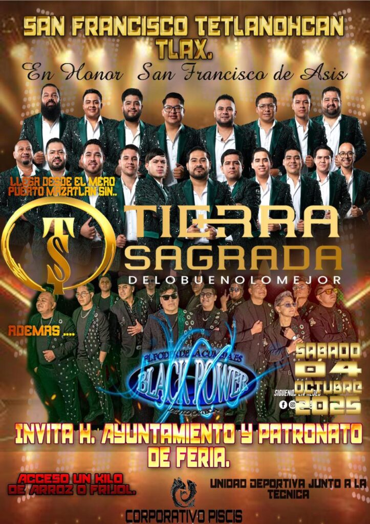 El H. Ayuntamiento de San Francisco Tetlanohcan, que encabeza la presidenta municipal Kritsbey Pérez Flores, en coordinación con el Patronato de Feria, invita a la ciudadanía a disfrutar de un magno baile como parte de las festividades en honor a San Francisco de Asís.
