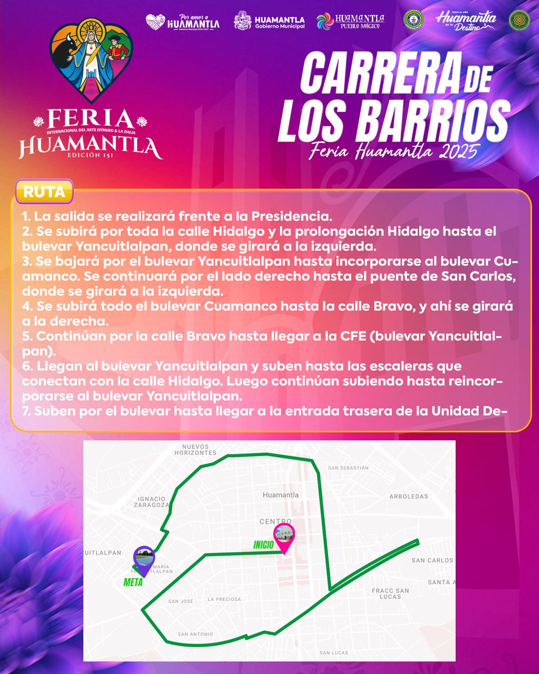 El Gobierno Municipal de Huamantla, que encabeza Salvador Santos Cedillo, informa que este viernes 8 de agosto se llevará a cabo la tradicional Carrera de los Barrios, actividad deportiva emblemática de la Feria Internacional del Arte Efímero y de la Dalia Huamantla 2025.