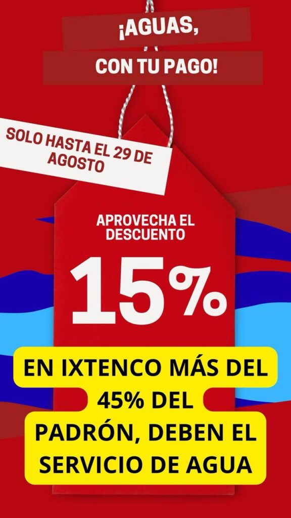 El Gobierno Municipal de Ixtenco informa a la ciudadanía que se encuentran en los últimos días de la campaña de regularización del servicio de agua potable, la cual otorga un descuento del 15% en el pago correspondiente. La fecha límite es el 29 de agosto.